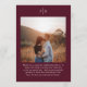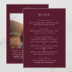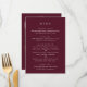 Classic style wedding menu featuring a simple yet elegant design in a deep burgundy colour that is perfect for a fall wedding or a winter / Christmas wedding. Use the template to add a photo or remove it in the design editing tool.