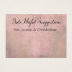 Here's a fun accessory to pick up for your engagement party or joint shower: date night suggestion cards on which guests can write personal notes to the bride and groom. On the front you read "Date Night Suggestions" in an elegant, modern script font; this typeface is editable so you can choose another if you prefer... or even write a different message. Below there's a place for your names. All words are presented in black type. Both front and backs of the card were covered in a subtle, distressed grunge image that features swirling lacy designs and burlap, along with pink and beige elements. The texture was covered in an opaque white overlay meant to lighten the surface and provide plenty of contrast for the text both printed and written on the surface. The back was left without words, providing a space for longer, personal handwritten notes your guests are encouraged to provide. Please do not hesitate to reach out to me if you have special requests or need other items. I am also happy to help with customisation of these cards if you need. //