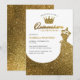 Gold glitter Quinceañera invitations with a sparkling ball gown and crown design create an elegant and regal way to celebrate a young woman’s milestone 15th birthday. Featuring a stunning faux-glitter look with a gold palette, this invitation combines glamour with sophistication. The eye-catching elements include a glittery dress, a crown, and graceful typography that blends handwritten script and simple modern fonts for a balanced, formal style. The back of the card continues the theme with a full gold glitter effect, adding a luxurious finish. Perfect for formal Quinceañera celebrations, this invitation sets the tone for a magical, star-studded event. Available as printed cards or an instant digital download.