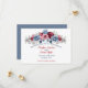 Elegant floral design features deep cranberry, pink and dusty blue roses, along with soft grey botanicals, leaves and wildflowers that drape over the text "Save the Date for the Wedding of", which is done in a simple dusty blue text. The bride to be and grooms' names are in a burgundy red contemporary script. Below that is the date and location of wedding in blue and "Invitation to Follow" in burgundy red italics. The reverse side of the card is a solid dusty blue.