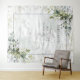 Create the perfect wedding photos with this trendy, elegant backdrop tapestry, featuring light dusty blue eucalyptus greenery botanical elements, a dusty blue frame and faux Carrera marble background. Part of a wedding invitation suite. Copyright Elegant Invites, all rights reserved.