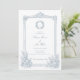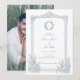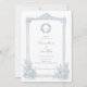 This dusty blue vintage ornate frame botanical wedding photo invitation design sets a refined and romantic tone for your special day, perfectly embodying timeless classic elegance with a touch of French country charm. Featuring a crisp white background adorned with delicate dusty blue line-art botanical florals, an intricate vintage ornate frame, and a custom monogram wreath at the center—paired with a dedicated side/reverse photo slot to showcase your cherished couple portrait—this design blends elegant script calligraphy with understated serif fonts for a polished, sophisticated feel.