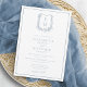 An elegant floral monogram wedding crest in a delicate line art style is the centerpiece of this dusty blue wedding invitation. Please view the collection to see the rest of the matching dusty blue floral monogram wedding crest invitation suite, and more matching products.