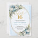 Celebrate a milestone moment with this elegant Sweet Sixteen invitation, featuring a refined watercolor design of dusty blue florals blended with soft white flowers and fresh eucalyptus greenery. Framed by a shimmering gold glitter border and paired with graceful script lettering, this invitation sets a sophisticated tone for a truly unforgettable Sweet Sixteen, Sweet 16th, or 16th birthday celebration.
