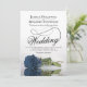 This beautiful wedding invitation features a gorgeous photograph of a single long stemmed dusty blue grey coloured rose lying on its side reflecting in a pool of water with waves and ripples. The design features a fancy calligraphy script with a long curly tail making it both modern and classic. Elegant, sophisticated and chic way to invite your friends and family to share in your special day. The back of the card is a marbled blue grey or pewter colour with a plush pattern.
