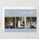 This save the date invitation features an elegant modern minimalist style of a three (tri) photo collage with a modern calligraphy of the wording "Save the Date" and elegant Serif fonts for a clean minimalist and modern look on a dusty blue background, which is a beautiful way to inform about your upcoming wedding. Announce to your family and friends you are getting married with this invitation and add a personal touch with beautiful pictures of you and your soon-to-be better half. The simplicity of this design adds a touch of elegance to your wedding. It works well with many wedding themes and definitely a great addition to your wedding. Just customise the names and wording in a few easy steps and personalise the invitation card with your photo of the happy couple and replace the QR Code with yours.