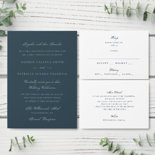 A refined wedding invitation featuring a rich dusty blue background paired with elegant white script and classic serif typography. This design combines traditional styling with a sophisticated colour palette, creating a look that feels both timeless and distinctive.