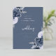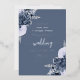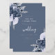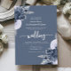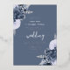This elegant wedding invitation features dusty blue floral bouquets set off with silver faux foil greenery in two corners, on a dusty blue background. The customizable text combines real silver foil serif, italic and handwriting fonts. The reverse side features a matching dusty blue and silver floral design.