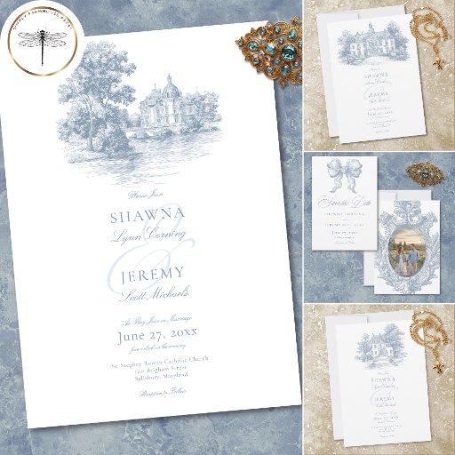 Elegant Dusty Blue Toile French Manor Wedding Save The Date