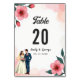 This elegant watercolor floral wedding table number is perfect for a modern wedding. The romantic design features an elegant watercolor floral frame with a bride and groom illustration and black calligraphy on a white background.