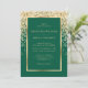Elegant emerald green and gold wedding invitation featuring wedding details inside a gold framed adorned with confetti.