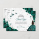 Emerald green silver and white Quinceanera thank you card. Features brunette girl in ball gown dress, script font, silver butterflies, dark green roses and tiara. Perfect for an elegant princess style glam celebration. Personalize with your own details.