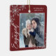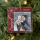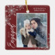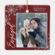 This red square Christmas ornament is a perfect gift for the newly engage couple. The design features a photo frame with handwritten text "Engaged" and is accented with light grey snowflakes on a red background. Personalise with a pictures of the couple, their names and year.