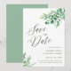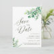An elegant wedding save the date invitation featuring watercolor eucalyptus and botanical leaves with a simple classic calligraphy and sans serif font.