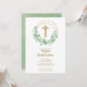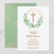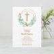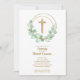 Elegant christening invitations feature a gold faux glitter cross, a eucalyptus leaf wreath and your details in chic lettering on the front. Gold dots on a green watercolor are featured on the back, perfect for your child's first communion, baptism or christening. MATCHING items available in our store.