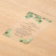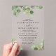 Elegant clear acrylic wedding invitation featuring watercolors of sage green eucalyptus greenery with gold accents, stylish script and modern typography.