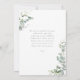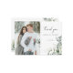 This unique botanical design features a curving branch of elegant watercolor eucalyptus leaves with artistic silver outlined leaves and white wildflowers. Also features photo template and message text on back.
