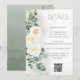 This elegant eucalyptus greenery wedding details card showcases white roses, flowing botanical elements, and delicate gold accents for a refined and nature-inspired design. Ideal for providing reception details and wedding information in a cohesive suite.