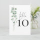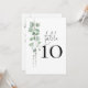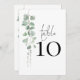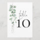 Elegant Eucalyptus Script Wedding Table Number. Table is set in a handwriting style script and your table number beneath with watercolor foliage to the left hand side. Easily personalise the number. The same design is on the other side and will update simultaneously as you make your change to the number.