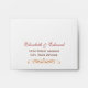 Custom wedding invitation envelopes feature a custom reply address and scroll design accent in rich fall / autumn colour scheme - shades of red, brown, and copper orange.