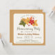 Cute, elegant, colourful, modern housewarming party invitation with orange, red, yellow, olive green fall leaves, autumn season theme flower and green fonts on off white background. Square invite with rounded corners and retro watercolor style fonts. Great year round for fall, autumn season new home, house, housewarming parties.