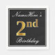 This simple and elegant paper napkin design features a message like "NameHere’s 2nd Birthday" (with the "2nd" having a faux gold-like colouring) within a black-coloured square area featuring a simple border outline. The name is in a white-coloured script-like text, and can be customised. Napkins like these could perhaps be used at a birthday party for somebody who is celebrating their second birthday. [~Z0000136]