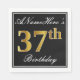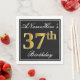 This simple and elegant paper napkin design features a message like "ANameHere’s 37th Birthday" (with the "37th" having a faux gold-like colouring look) within a black-coloured square area featuring a simple border outline. The name is in a white-coloured script-like text, and can be personalised. Napkins like these could perhaps be used at a birthday party for somebody who is celebrating their thirty seventh birthday. [~Z0000136]