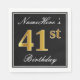 This simple and elegant paper napkin design features a message like "NameHere’s 41st Birthday" (with the "41st" having a faux gold-like colouring look) within a black-coloured square area featuring a simple border outline. The name is in a white-coloured script-like text, and can be personalised. Napkins like these could perhaps be used at a birthday party for somebody who is celebrating their forty first birthday. [~Z0000136]