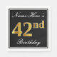 This simple and elegant paper napkin design features a message like "Name-Here’s 42nd Birthday" (with the "42nd" having a faux gold-like colouring look) within a black-coloured square area featuring a simple border outline. The name is in a white-coloured script-like text, and can be customised. Napkins like these could perhaps be used at a birthday party for somebody who is celebrating their forty second birthday. [~Z0000136]