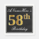 This simple and elegant paper napkin design features a message like "ANameHere’s 58th Birthday" (with the "58th" having a faux gold-like colouring look) within a black-coloured square area featuring a simple border outline. The name is in a white-coloured script-like text, and can be personalised. Napkins like these could perhaps be used at a birthday party for somebody who is celebrating their fifty eighth birthday. [~Z0000136]