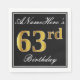 This simple and elegant paper napkin design features a message like "ANameHere’s 63rd Birthday" (with the "63rd" having a faux gold-like colouring look) within a black-coloured square area featuring a simple border outline. The name is in a white-coloured script-like text, and can be personalised. Napkins like these could perhaps be used at a birthday party for somebody who is celebrating their sixty third birthday. [~Z0000136]