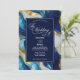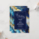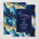 A wedding invitation featuring a faux gold, blue and white marbled design.