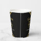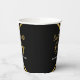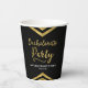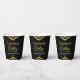 These modern paper cups feature an elegant geometric chevron design and the words "Bachelorette Party" in faux gold foil against a black background.