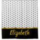 Black polka dots are on a white shower curtain. At the bottom, there's a black band with a faux gold script. There's a faux gold line between the black band and the polka dot pattern.