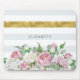 This beautiful pink floral mousepad speaks modern elegance, featuring romantic pink roses against a trendy backdrop of soft grey and white striped pattern embellished with a stripe of glittery gold. Personalise this feminine flowers and stripes design by adding your name. The gold is a flat printed image, NOT gold glitter.