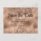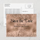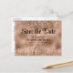 A formal, elegant save the date postcard featuring a faux rose gold glitter and foil design.