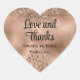 This sticker features the message "Love and Thanks" with the bride and groom's name and wedding date on a rose gold glitter and foil background.