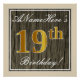 This simple and elegant birthday party poster design features a personalised message like "ANameHere’s 19th Birthday!" (with the "19th" having a faux/imitation gold-like colouring look) within a rustic faux/imitation wood appearance square area featuring a simple border outline. The name is in an elegant white-coloured script-like text, and can be customised. A personalised birthday party poster like this could perhaps be used as a decoration at a party being held for somebody who is celebrating their nineteenth birthday. [~Z0000233]