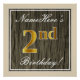 This simple and elegant birthday party poster design features a personalised message like "NameHere’s 2nd Birthday!" (with the "2nd" having a faux/imitation gold-like colouring look) within a rustic faux/imitation wood appearance square area featuring a simple border outline. The name is in an elegant white-coloured script-like text, and can be personalised. A personalised birthday party poster like this could perhaps be used as a decoration at a party being held for somebody who is celebrating their second birthday. [~Z0000233]