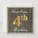 This simple and elegant birthday party invitation design features a personalised message like "FirstName’s 4th Birthday" (with the "4th" having a faux/imitation gold-like colouring look) within a rustic faux/imitation wood appearance square area featuring a simple border outline. The name is in an elegant white-coloured script-like text, and can be personalised. The back features personalised invitation details. A birthday party invitation like this could perhaps be used when inviting people to a birthday party being held for somebody who is celebrating their fourth birthday. [~Z0000231]
