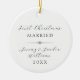Simple and elegant, customisable first Christmas married ornament with your wedding date and names in script text. White ceramic bauble, double-sided with the same design, ideal as Holiday keepsakes for the newlyweds.