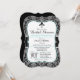 Aqua blue, Black, and white elegant Paris, France, French glamour theme bridal wedding shower invitation on black damask pattern. Features Fleur-de-lis and vintage formal design elements.