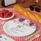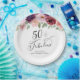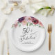 Elegant paper plates for her 50th birthday party featuring "50 & Fabulous" in a stylish script and watercolor bouquets of burgundy red, blush pink and purple florals with light sage greenery.