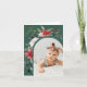These beautiful holiday photo cards feature your favourite personal photo on the front, surrounded by a modern arch shape full of classic watercolor Christmas poinsettias, flowers, and greenery and gold script calligraphy that says "joy" on a festive green background. Traditional and elegant red green and white floral illustrations also decorate both the inside and back. The inside of the card also features room for a second photo and your own personal message for the season.