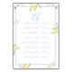 This alphabetic seating display features a charming blend of blue and yellow watercolor florals, creating a fresh and cheerful botanical look. Soft petals and subtle greenery frame the layout beautifully, while the alphabetical organization keeps guest names easy to follow.
