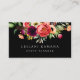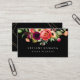 Elegant watercolor bohemian style flowers, feathers and foliage in chic shades of purple, burgundy, pink, peach and green with gold geometric accents on back, business cards. Background colour, shown in black, can be customised.
