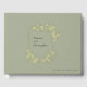 This wedding guest book showcases an elegant and timeless design with a delicate gold foil floral crest frame. The names of the bride and groom are beautifully displayed at the centre in a clean, sophisticated font, while the date and location of the wedding are subtly placed at the bottom right. The soft and graceful aesthetic, combined with the dainty hand-drawn floral details, adds a refined, romantic touch, making it a perfect keepsake for a memorable wedding event.