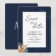 Dark blue 'save the date' for weddings, with watercolor apricot flowers and garden foliage. A simple yet elegant contemporary botanical design inspired by boho vintage style, with monogram on the back.