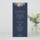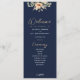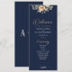 Dark blue program for weddings, with watercolor apricot flowers and garden foliage. A simple yet elegant contemporary botanical design inspired by boho vintage style, with monogram on the back.