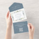 This design features modern dusty blue floral greenery, a botanical QR code response reply, a flowers roses leaves babies breath, a guest response via website online, a scannable QR code scan email, an elegant seal and send trifold, a stylish trendy calligraphy script font, an ampersand typography style overlay text, a beautiful soft romantic garden design, a vintage summer fall winter flowers